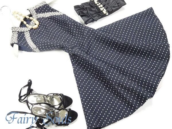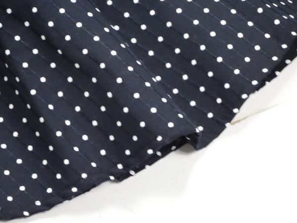 ビジュー飾りとドット柄が魅力的なワンピ-ス。襟もとから肩にかけて大小のビジューがあしらわれ、光を受けておキラキラと輝き華やかな印象を醸し出しています。落ち着いた黒地に約1cm感覚で黒糸の線を編みこみ、ライン上に小さな白いドットが美しく並び、上品でエレガントな雰囲気を漂わせています。お呼ばれ、デート、コンサート等、どんなシーンでも活躍してくれる貴重な一着です。背中ファスナー。左右脇ポケット付。裏地あり。