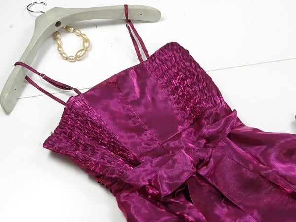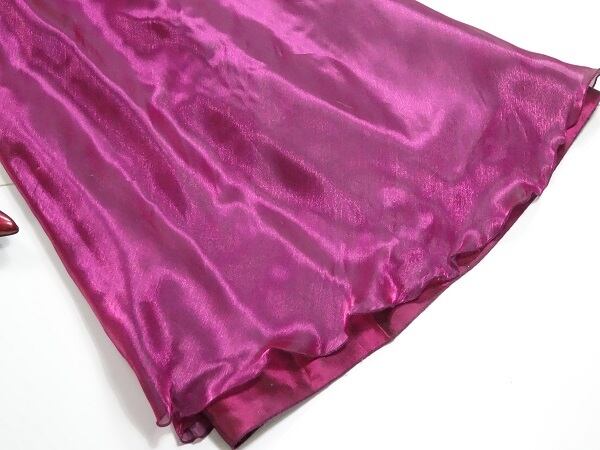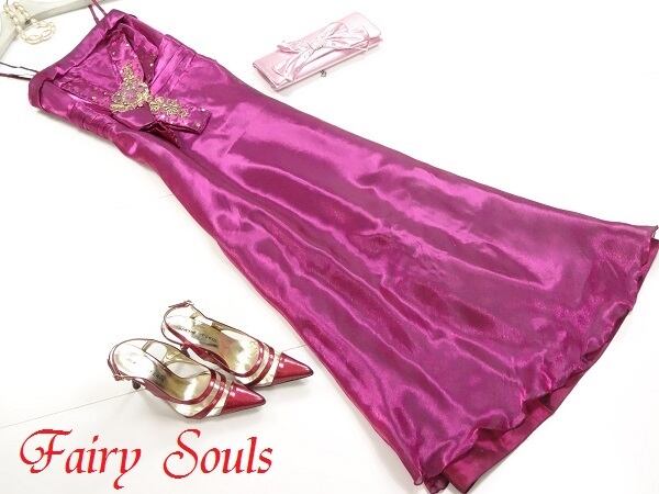 光沢のあるサテン素材にオ-ガンジ-風生地を重ねたロングドレスです。胸元の豪華なリボン装飾がポイントになります。発表会や演奏会や舞台衣装にお薦めです。裏地有。