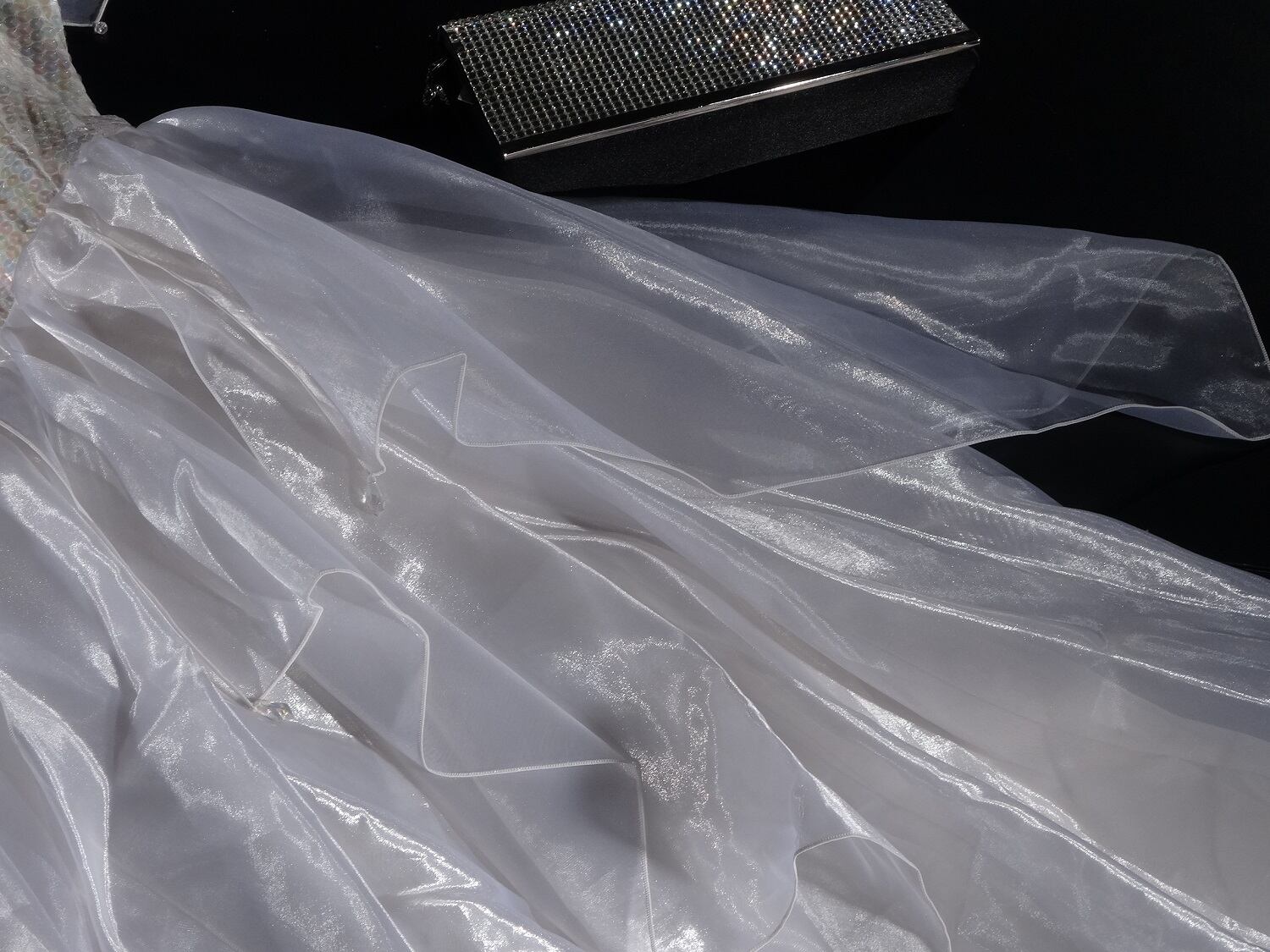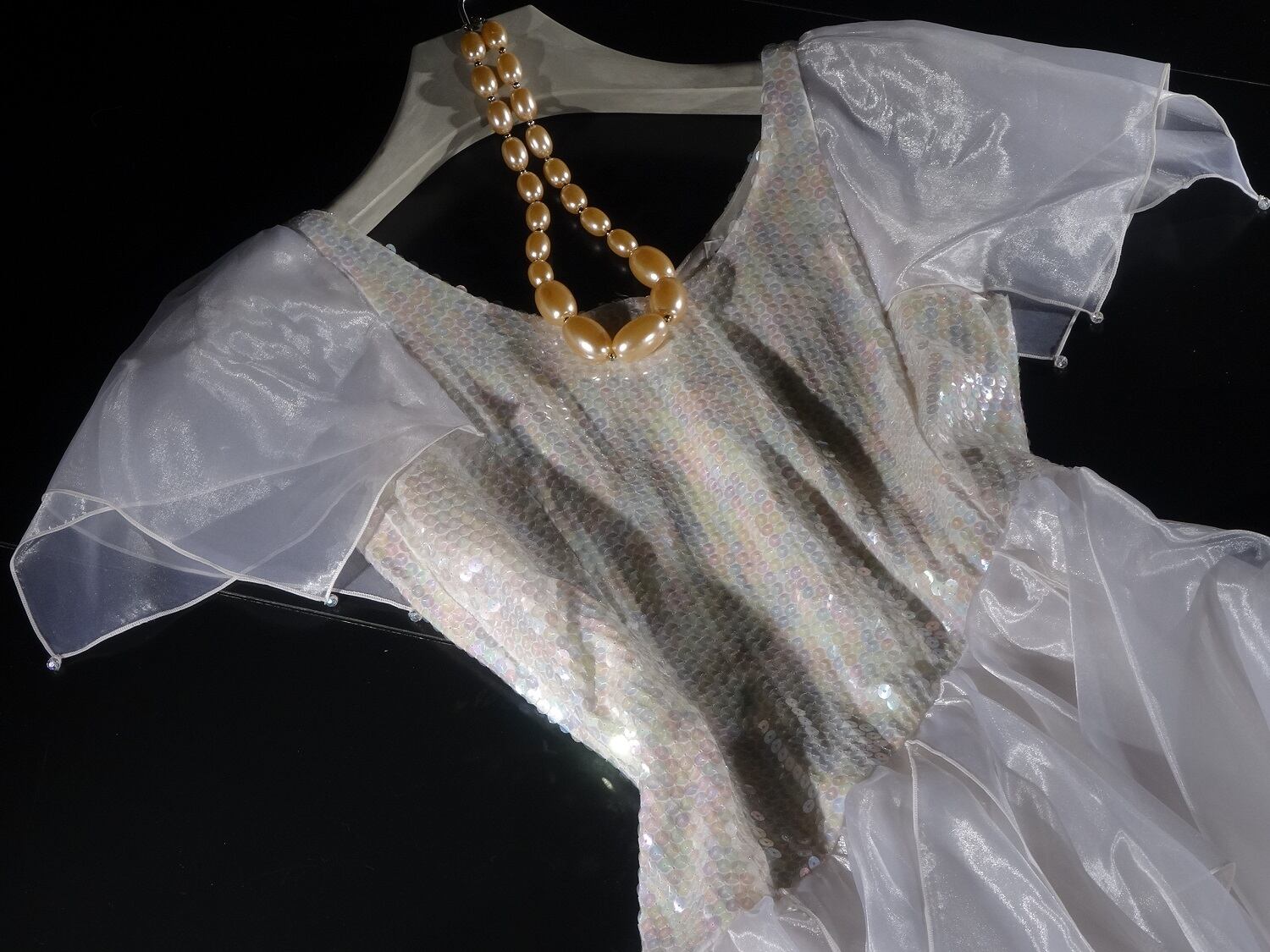 透け感が美しいFemminaのダンスドレスです。ピュアな白が優しく見えて、ふんわりとしたスカートが優雅で品の良いシルエットを作っています。裏地あり。