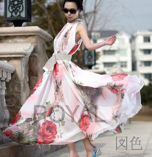 華やかで上品な花シフォンマキシ丈ワンピースです。全体に大きな花柄がプリントされたしなやかでやわらかな生地がたっぷりと使われています。裾は十分な生地を使用していますので、歩くたびになびき足の動きをキレイに見せてくれます。裏地付。