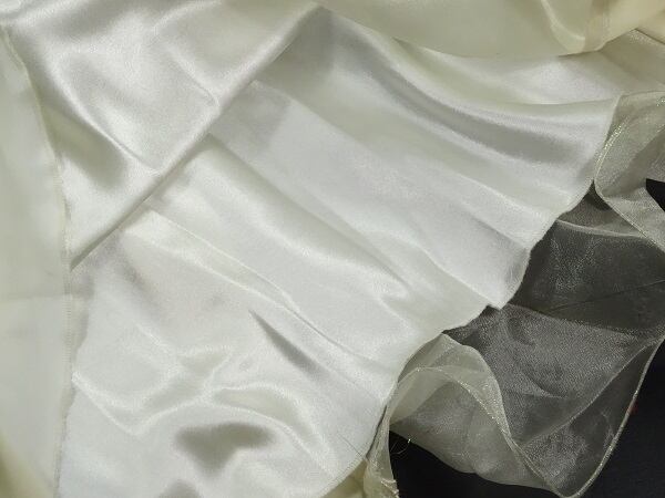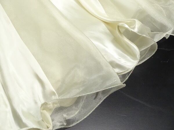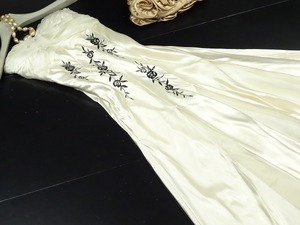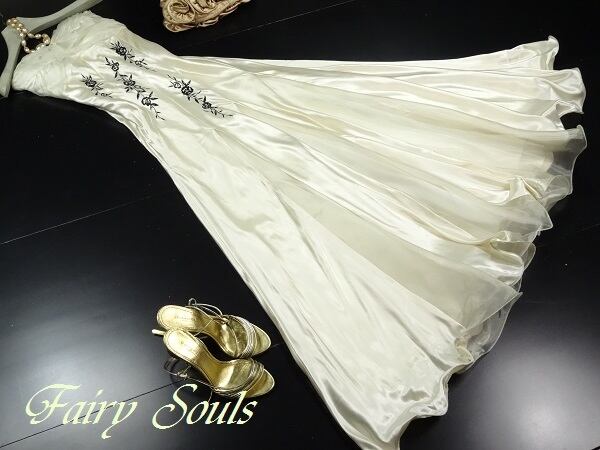 上質な素材感の女性度アップパ-ティ-ドレスワンピです。胸元から腰にかけて刺繍が施されとても豪華また裾が異なる素材になっていて動くたびに揺れ女性度UP!!裏地あり。