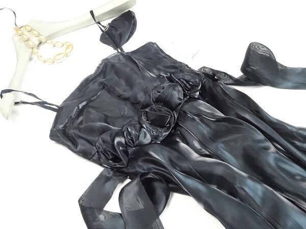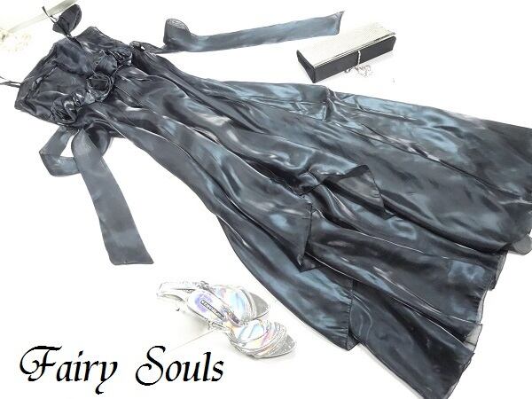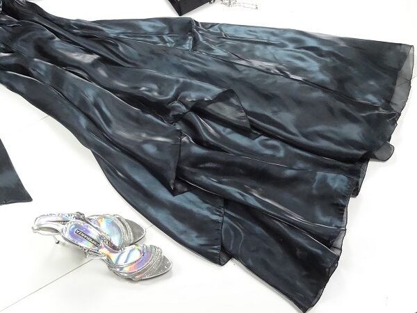 シフォンの光沢素材にチュ-ルを縫い合わせたスタイルです。胸元には、花モチ-フ。ステ-ジ衣装などに最適なドレスです。