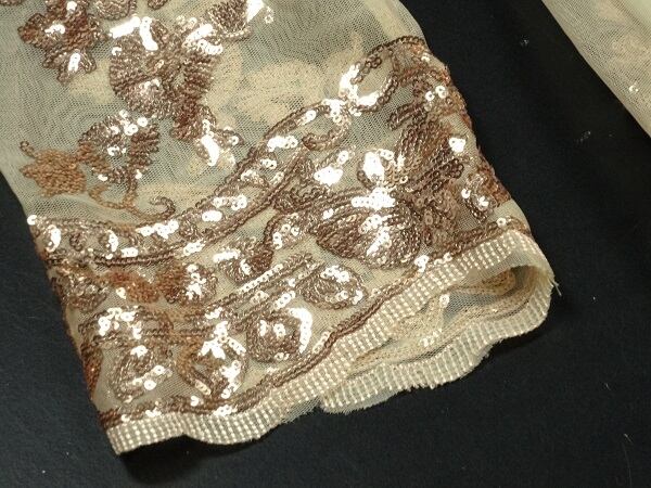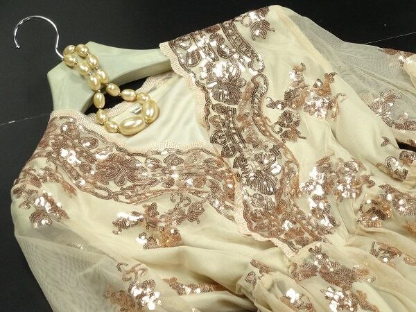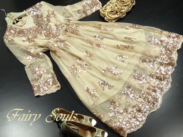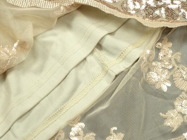 スパンコ-ル飾り豪華なフレア-ワンピ-スです。全体的にゴールドベージュのレースにゴールドのビジュ-がたくさんあしなわれとても豪華なデザインです。ファスナーなし(かぶるタイプ)。裏地あり。