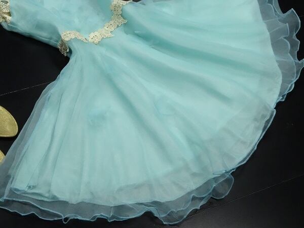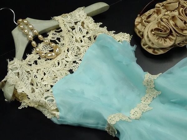 艶やかなオーガンジーがたっぷりと使用された膝丈のミニドレス。同じオーガンジーの蝶のモチーフがいっぱいあしらわれているフェアリーなデザイン。胸元、袖口、ウエストには繊細な模様のレース仕様になっていて、オーガンジーとレースの異素材の組み合わせが絶妙なハーモニーを作り出しています。品が良く、可愛い印象を与えてくれる一着です。左脇ファスナー。裏地あり。