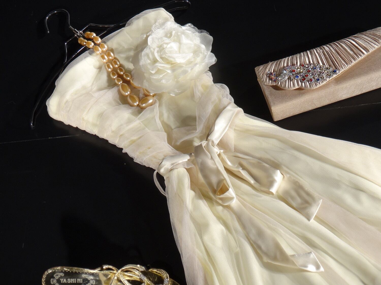 胸元のコサージュウエストリボンがキュートなミニ丈チュールのミニベアトップドレスです。胸もとはふんわりとしたチュールのドレープがエレガント。ウエストのリボンが可愛らしさをアップ。お呼ばれ、結婚式の二次会、デ-トなど特別なシーンやパーティーに最適です。コサージュ取り外し可。共布ウエストリボンベルト付。サイドファスナー。裏地あり。