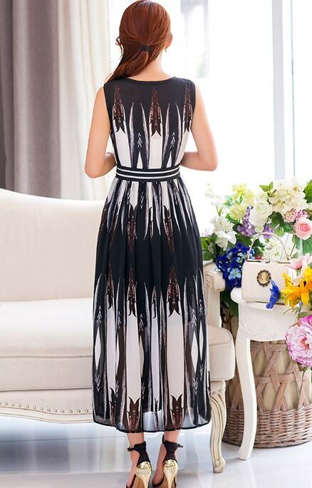 モノトーンのアート柄がプリントされたシックなワンピース。襟もとはシンプルなラウンドネック。ウエストの黒と白のストライプが全体をキュッと引き締めています。軽くてしなやかなシフォンフレアが足元を美しく魅せてくれています。白のキャミソールインナー付。品が良く、魅力的な一着です。ファスナーなしのかぶるタイプ。裏地あり。