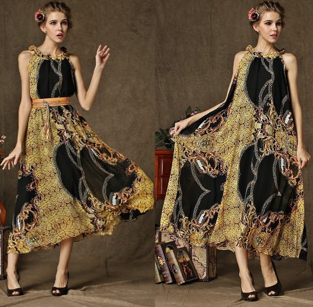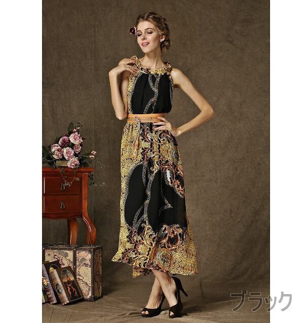 シックなイエローブラウンの地にボヘミア風な模様がプリントされたワンピース。襟もとにはかわいいフリルがほどこされ、軽くてしなやかなシフォン生地をたっぷりととったフレアに、ウエストのベルトがクールな印象に仕上げています。落ち着いた品の良い一着です。ファスナーなしのかぶるタイプ。ベルト付。裏地あり。