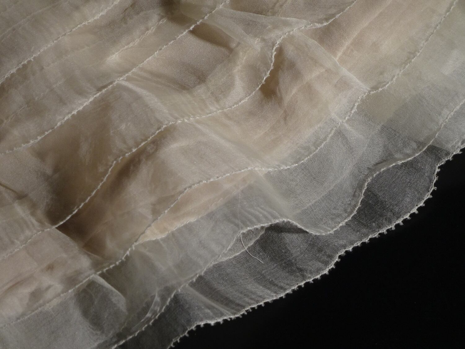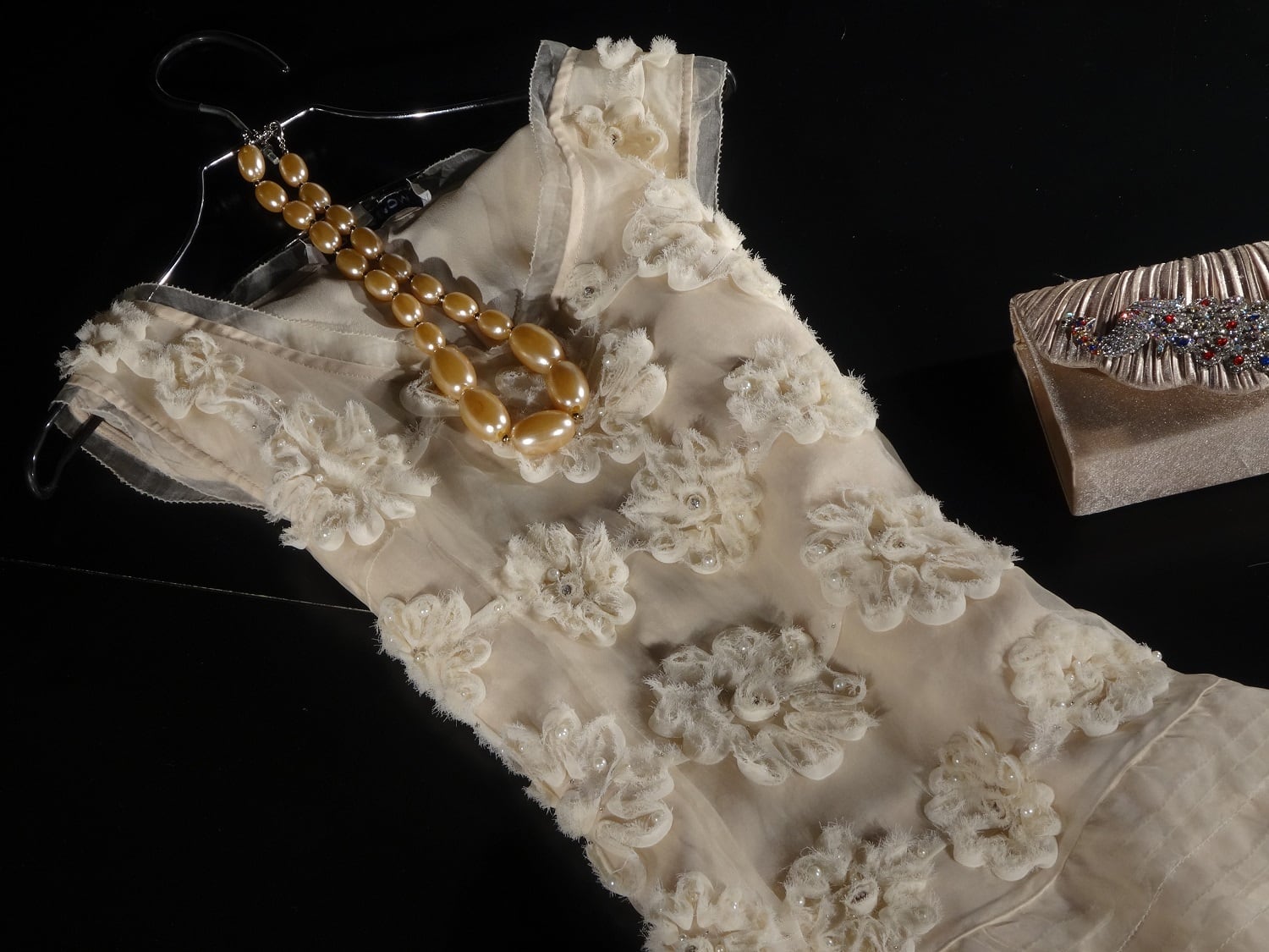 オ-ガンジ-のシルエットにシフォンの花とフリルデザインのワンピ-スです。花柄の中には、パ-ルとビジュ-が装飾されています。裏地あり。