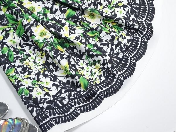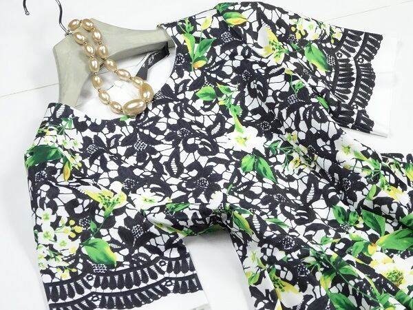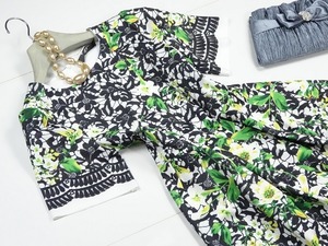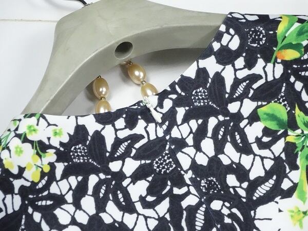 黒い花柄に白い花の彩色プリントを施したボタニカルデザインのワンピ-スです!!着心地滑らか生地感がとても魅力てきです。バックファスナ-有。裏地なし。