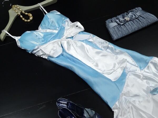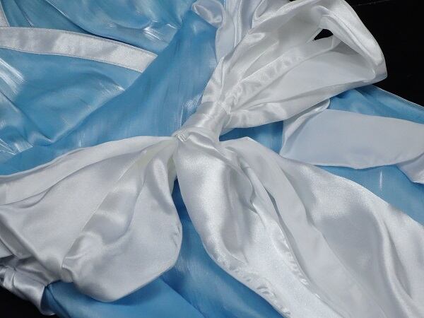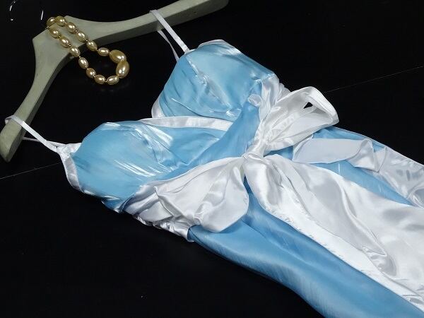 さわやかな水色とホワイトサテンのドレス。ハイウエストには大きな白のリボンがあしらわれ、胸元をより魅力的に見せてくれます。ボトムは、前後で裾の長さが違うフィッシュテールタイプ。ピュアな中にクールなセクシーさをあわせもった一着です。胸パッドあり。背中ファスナー。肩紐調整可。裏地付。