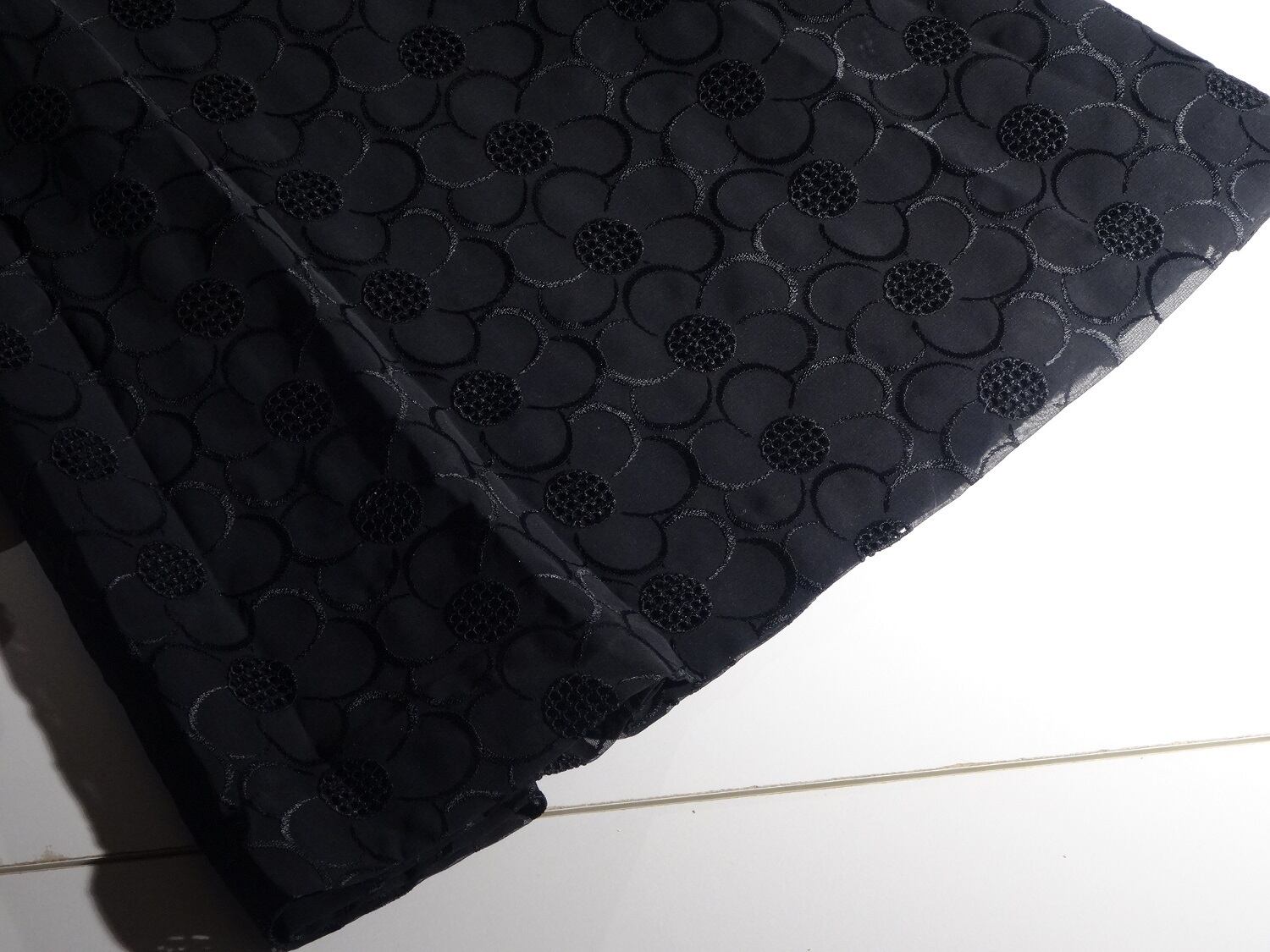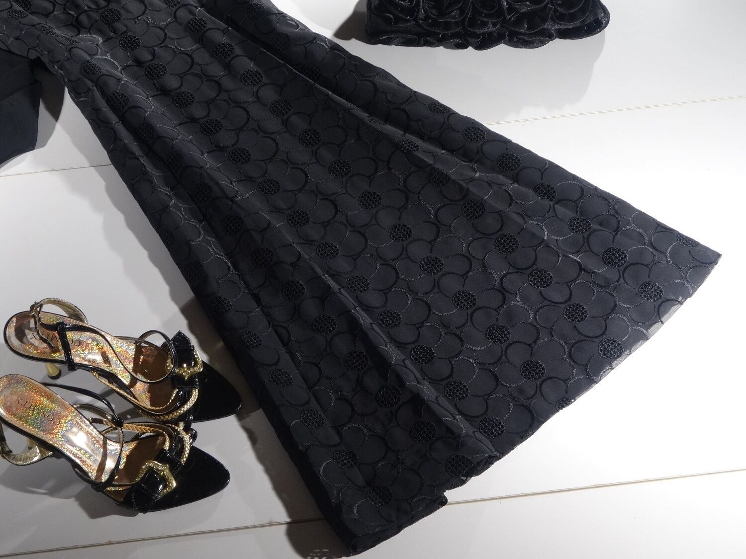 花レース刺繍が美しいワンピース。全体に花模様が刺繍とレースで描かれているシックなデザイン。袖はシースルーでほんのり二の腕を魅力的に見せています。シックでエレガントな一着です。背中ファスナー。裏地有。