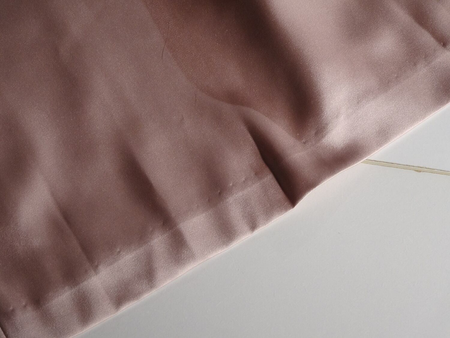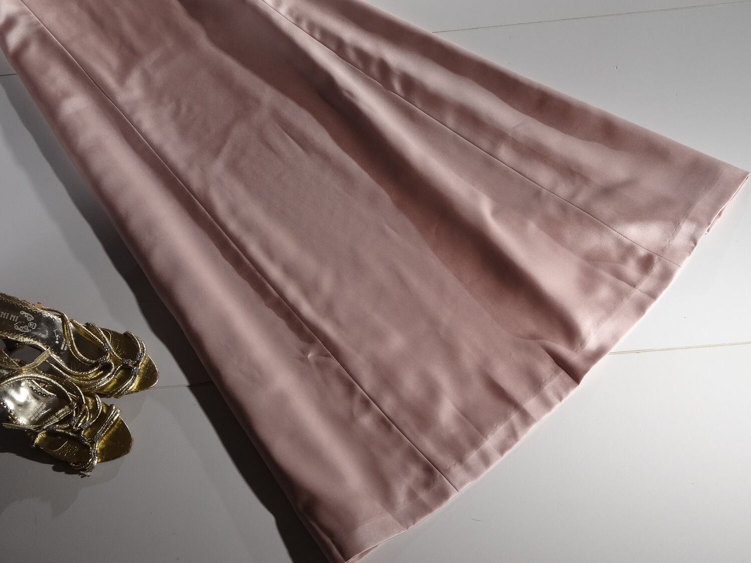 エレガントなピンクのロングドレス。無駄な飾りをはずしたシンプルなラインが、生地とフォルムの美しさを際立たせ上品な印象をかもしだしています。胸元のドレ-プが綺麗です。裏地あり。