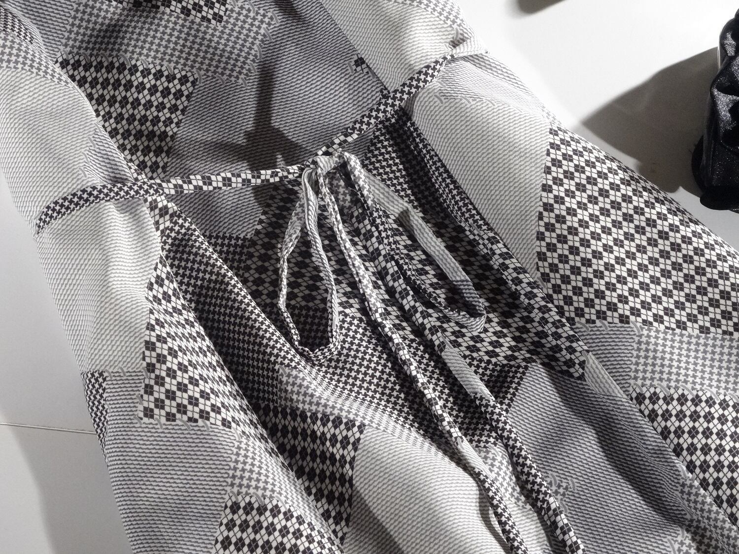 柄の上品なワンピースです。ウエストを紐ベルトで結んで腰から綺麗なフレア-が広がりとてもエレガントです。袖口のゆったりとした仕様も、豪華で華やかな印象に。アクセなしでも十分存在感のある一着です。背中ファスナー。 裏地有り。