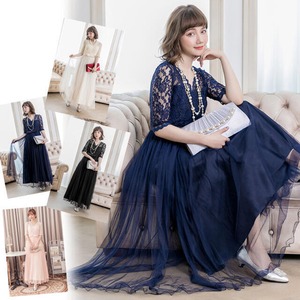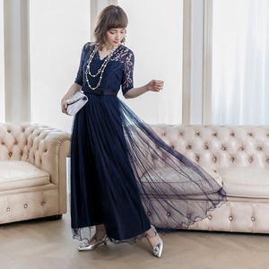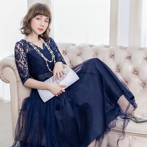 レースとチュールのエレガントなワンピ-ス。上半身と袖は刺繍を施したレース仕様で、ウエストのサテンのベルトで切り返しが入っています。胸元と背中はレースの縁取りのついたV字カット。裾まではサテン地にチュールをかぶせ、気品に満ちたとてもエレガントで上品なひとクラス上をいくデザインになっています。裏地なし(サテン地とチュール地の二枚重ね)。背中ファスナ-有。