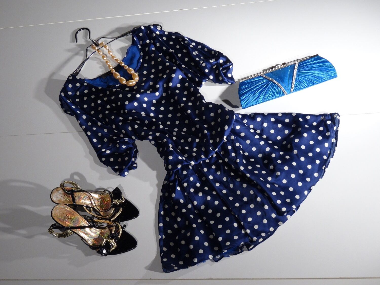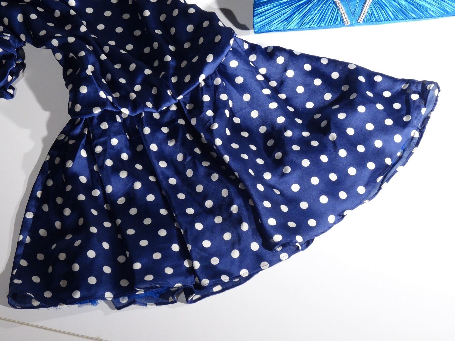 艶やかな紺の生地全体に白いドット柄がプリントされたワンピース。肩から袖先にかけて大きく開いた袖がセクシーで、袖先をキュッと絞っているのが可愛い印象を与えています。ウエストはゴム仕様。ファスナー付。裏地あり。