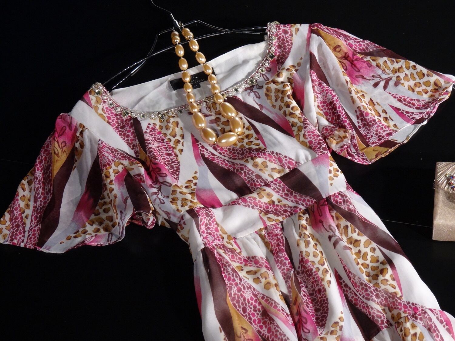 しなやかなシルク生地に紫系のアーティスティックな模様がプリントされたワンピース。襟元には大小のフェイクストーンとビーズがあしらわれています。ウエストとスカート中断に切替があり、シンプルなフォルムにアクセントをプラスしています。袖はバタフライシルエットで、ゆったりとしたデザインになっているので、腕が動きやすく綺麗に見せてくれます。ファスナーあり。裏地付。