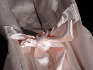 しっかりとした綿生地と淡いピンクカラーのギャップが魅力的なシャツタイプのワンピース。きっちりとした角のある大きな襟と少し丸みの帯びた袖とウエストの艶やかなピンクの幅広リボンベルトも不思議な可愛らしさを感じさせてくれます。隠し前ボタン留め。裏地あり。