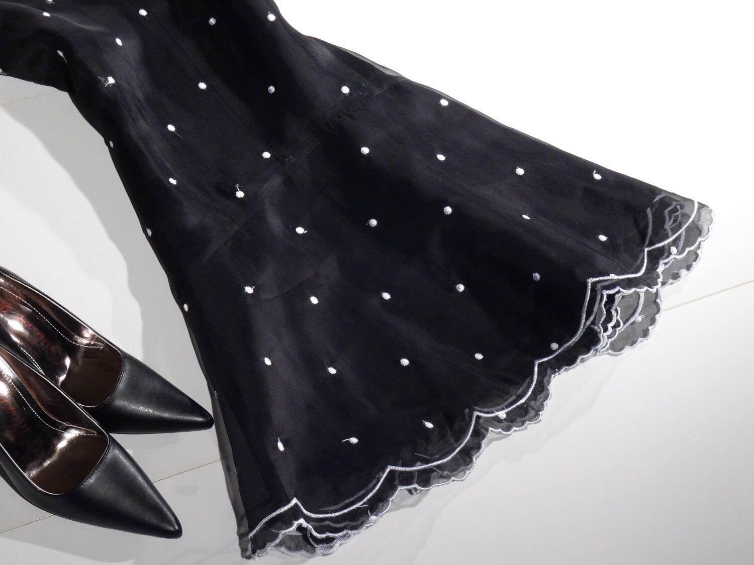 艶のある黒のシフォン地に白糸でかわいい小さなドット模様を刺繍した、キュートなデザイン。襟のフリルと、そでさきには白糸のバイアス仕様。お嬢様テイストの中に品の良さがバランスよく組み込まれた魅力的なデザインです。左脇ファスナー。裏地あり。