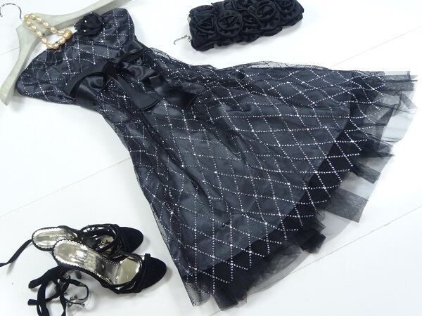 ダイヤ柄シルバ-ラメ付き黒色チュ-ルレ-ス&ダ-クシルバ-サテン生地の2枚重ねのドレスです。ウエストゴム。ダークグレ-地&シュ-ル付きバニエ付き、クリップ留めブラックコサ-ジュ付き、ブラックサテン地ベルト付、透明肩紐ストインには、バニエのチュ-ルが裾から見えるようになっています。サイドファスナ-有。