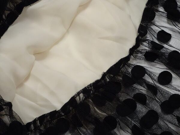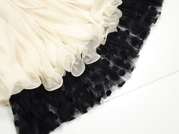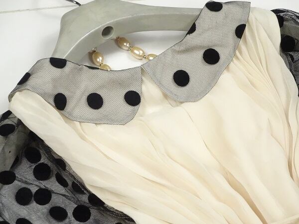 しなやかなベージュの人工シルク地に黒のドット柄がアクセントになっているキュートなワンピース。可愛い丸襟と袖、裾には黒のネット生地に黒のドット柄がデザインされていて、袖と裾は綺麗な透け感があります。ワンピースは2cm位のゆるいプリーツ仕様になっていて、ひもウエストベルトがついています。ピュアでフェミニンな印象の魅力的な一着です。ファスナーなしのかぶるタイプ。紐ベルト付。裏地あり。