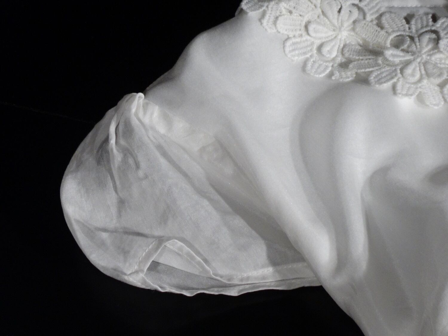 刺繍と柔らかい印象の女の子ワンピ-スです。シンプルなトップスに花刺繍な首回りに飾ってあり大変豪華です。ふんわりバル-ンのようなデザインです。左脇ファスナ-あり。裏地有。