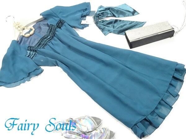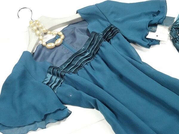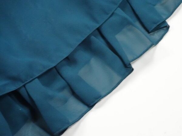 希少な大きいサイズ。シフォン生地でシルエットが綺麗に見えます。袖とスカ-ト裾のフリルがとてもお洒落な光沢感のあるワンピ-スです。大人の女性をイメージさせる綺麗なデザインの一着です。後ファスナー。裏地有。