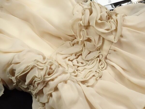 ウエストに薔薇のモチーフがあしらわれたピュアなワンピース。優しいラインの襟ぐりからしっとりとした袖が続き、薔薇モチーフのウエストから下は、たっぷりのフレアが可愛く、品の良いテイストを醸し出しています。お呼ばれや、結婚式の二次会など、幅広いシーンで活躍してくれる一着です。背中ファスナー。裏地有。