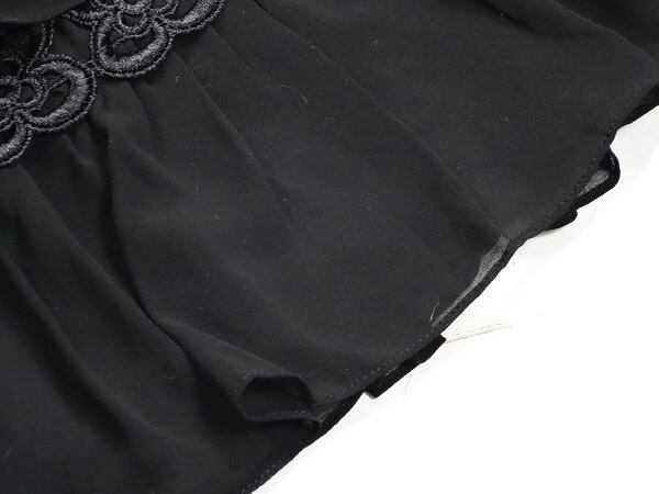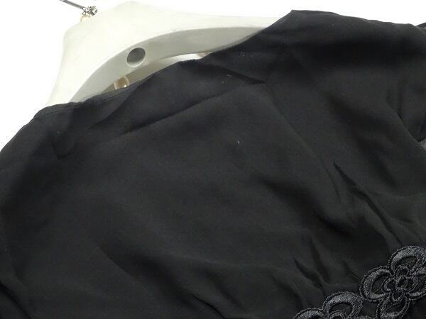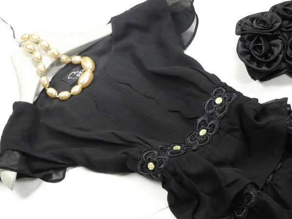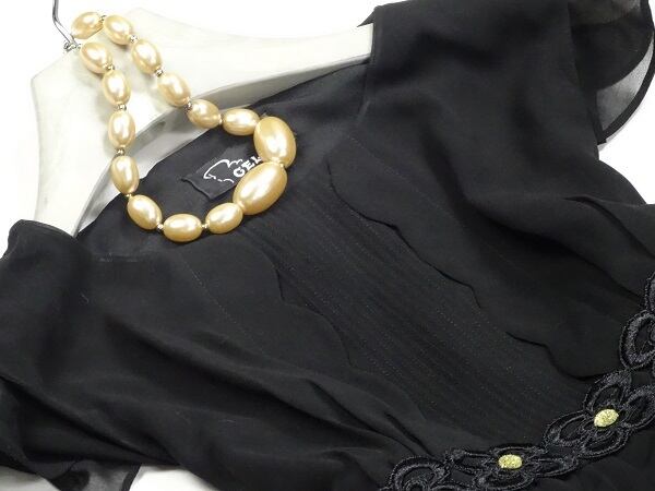 花刺繍とキラキラ輝くビジューストーン飾りのワンピース。ウエストからスカート部分に花の刺繍がほどこされ、ウエストにはキラキラ輝くストーンがあしらわれています。トップスには中央にプリーツをはさみ、左右の生地が波型にカットされた凝ったデザインになっています。品の良さがあらわれた、どんなシーンにも活躍してくれる一着です。右脇ファスナー。裏地付。