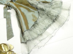光沢のあるメタリックグリーンが、可愛らしさの中にクールさを併せ持った華やかなドレスワンピース。ウエストの大きなリボンから裾にかけて生地が緩やかな曲線を描いてデザインされており、その下から、4段のチュールのフリルがクールプリティの中に豪華さをプラスしています。背中部分はゴム仕様になっていますので、サイズに幅があり、ゆったりと着て頂けます。