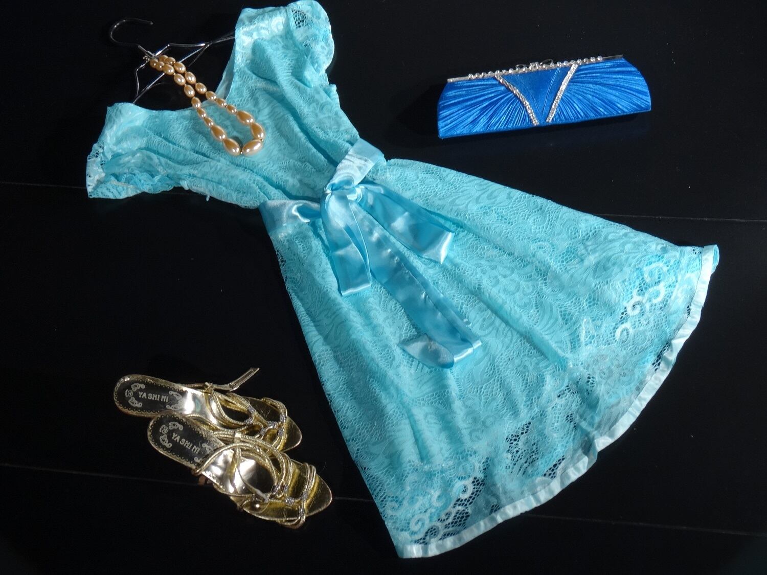 レ-スをあしらったデザインです。ところどころ光の反射で色が変わるとても魅力的なワンピ-スです。裏地も光沢感があるので煌びやかです。裏地有り。サイドファスナ-。リボンベルト付。