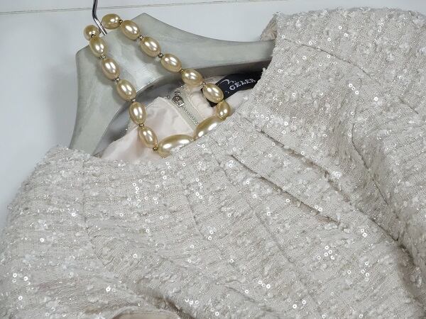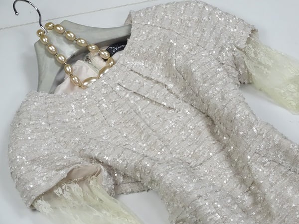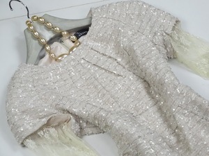 しっかりとしたツイード生地に透明なスパンコールが全体にちりばめられ、光を浴びてきらきら輝かくエレガントなワンピースです。袖は半袖の下から花模様のレース仕様に切り替わるユニークなデザイン。おしゃれでフォーマルな一着です。背中ファスナー。裏地あり(袖は裏地なし)。
