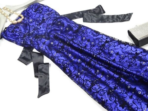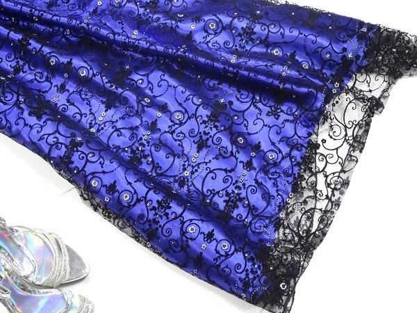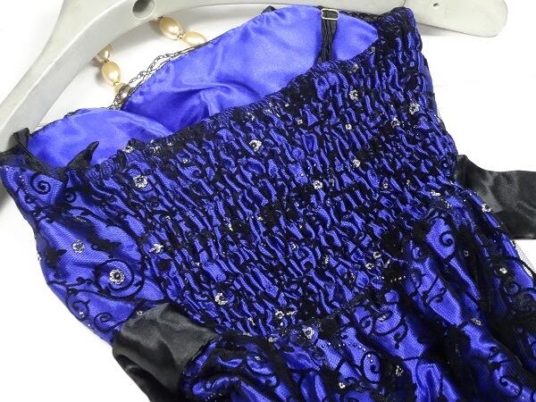 上質な光沢のあるロイヤルブルーのサテン地に、シックな黒のメッシュチュールをあわせた気品を感じさせるロング丈のドレスです。ドレス全体にスパンコールとつたのモチーフがあしらわれていて、たいへん豪華な印象になっています。背中側中央はシャーリング仕様になっているので伸縮性があり、着用サイズにゆとりがあります。ウエストにはサテンのリボンがぬいつけてあり、全体を引き締めてくれるアクセントになっています。胸パッドつき。肩紐調整可能。ファスナーなし。裏地なし。