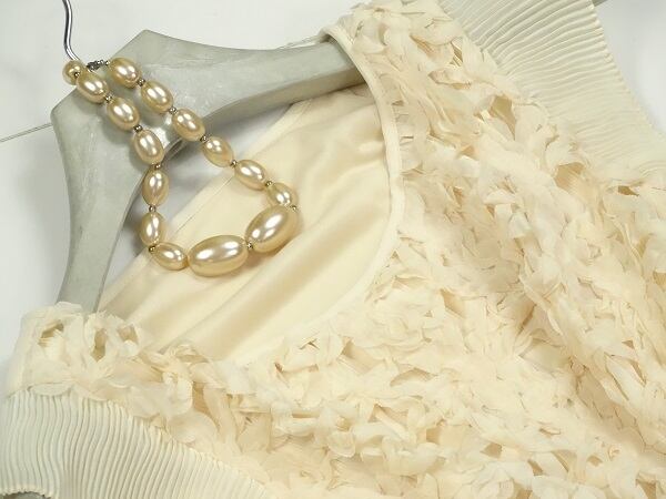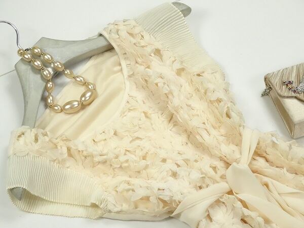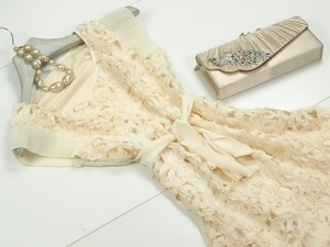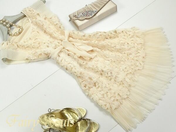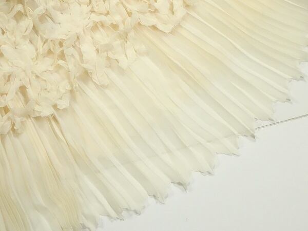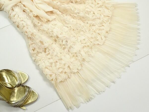 可愛らしさ200%の立体花柄プリ-ツワンピースです。全体のプリ-ツの上に花が散りばめられた大変豪華な一着です。布ベルト付き。裏地あり。