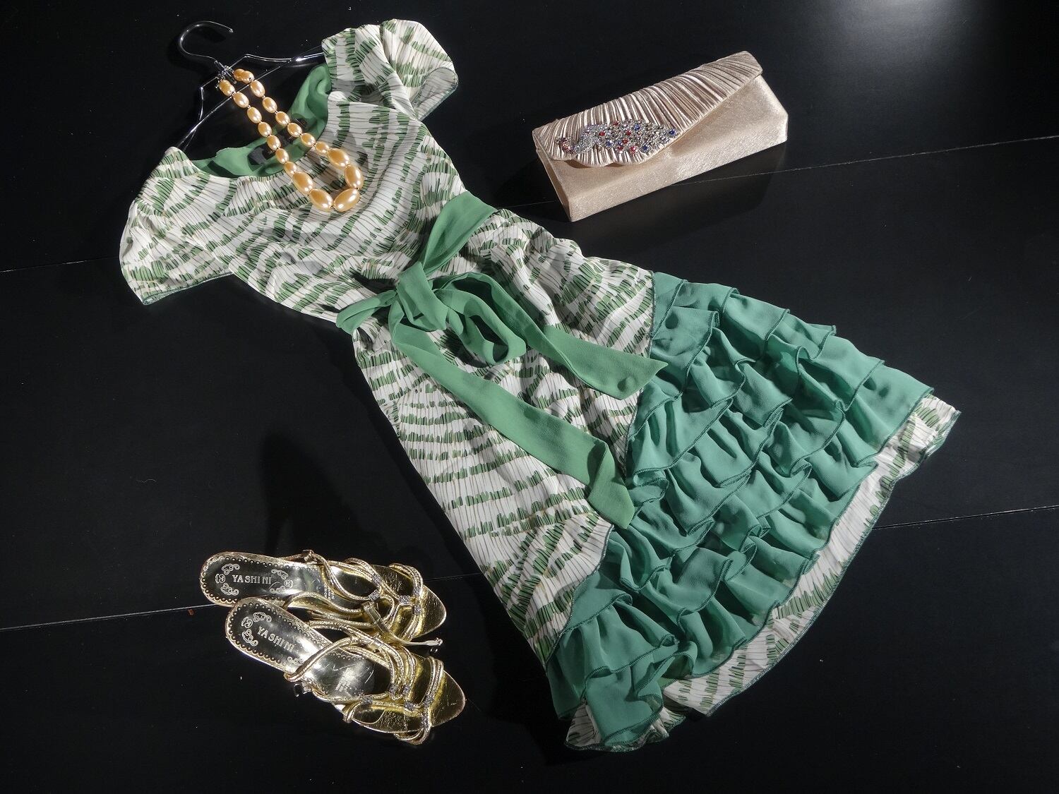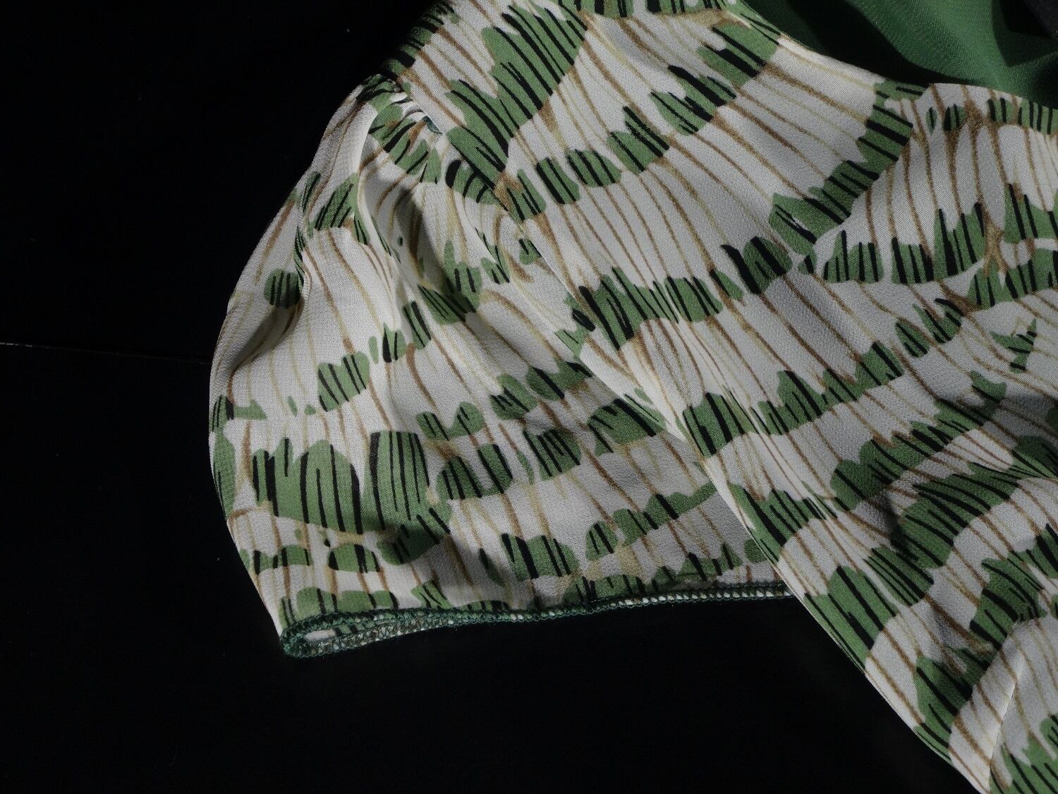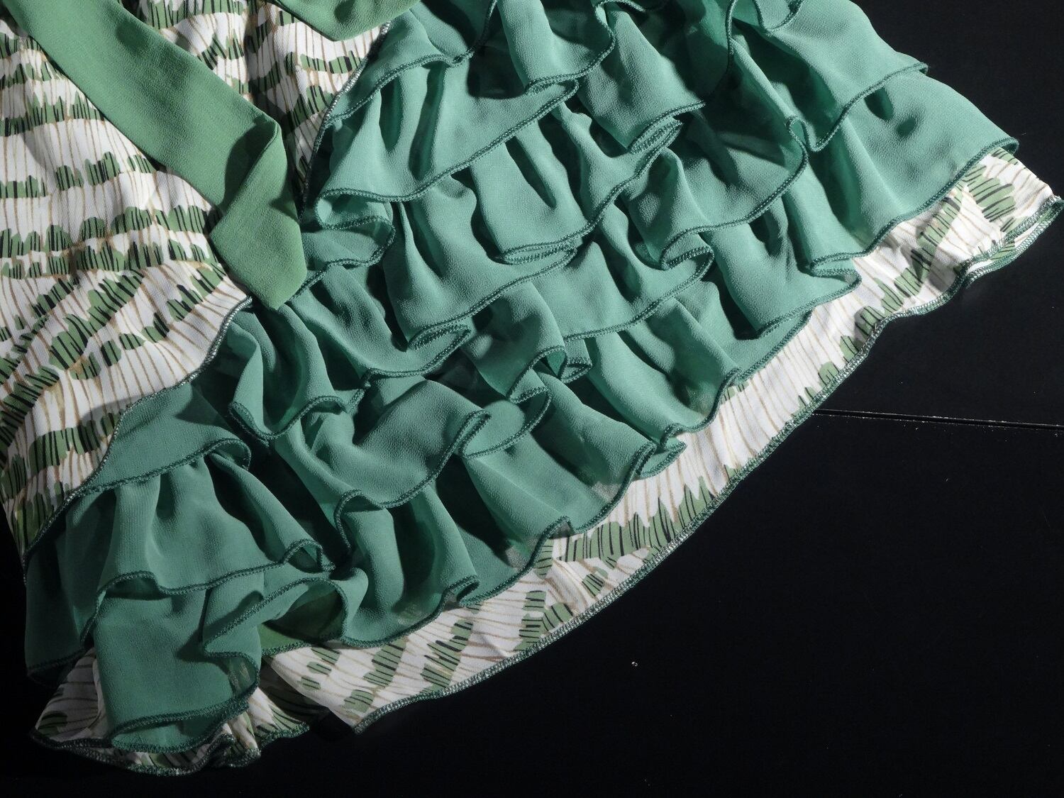 グリーンを基調とした抽象模様に変形レイヤーが魅力的なワンピース。ウエストから片方の裾にかけて斜めに布をカットし、下からは可愛いフリルが見えており、可愛くて華やかな、様々なシーンで活躍してくれる一着です。サイドファスナー。布ウエストリボンベルト付。裏地あり。