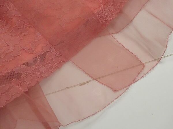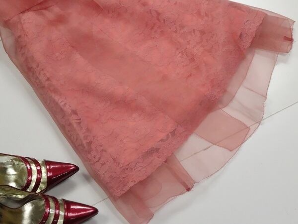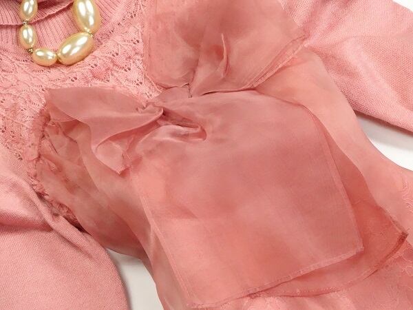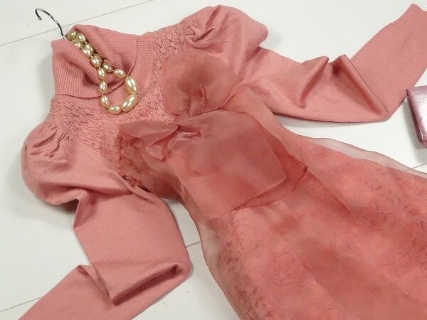 オーガンジーとニットの異素材ワンピース。ウエストから上はニット仕様。首元はリブ編みのタートルネック。胸もとは細いニットによる模様編み。ウエストからは下は、チュールにレース刺繍を施し、上にふんわりとピンクのオーガンジーをかぶせています。ウエストの大きなリボンがキュートで、着る人の魅力を何倍にもアップしてくれます。デートやコンサート、パーティやイベントにと、様々なシーンで活躍してくれる一着です。「XL」の表示がついていますが、11~13号位かと思います。ファスナーなしのかぶるタイプ。裏地あり。