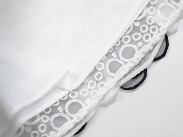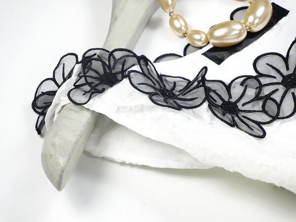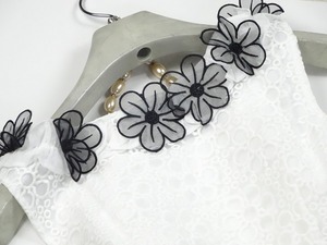 黒の花モチーフが美しい、キュートでシックなワンピース。白の立体レース刺繍生地に、オーガンジー素材の花モチーフが襟まわりと裾にあしらわれていて、シンプルなラインに華やかさをプラスしています。普段使いはもちろん、デートやライブ、お呼ばれ、結婚式の二次会にと、様々なシーンに活躍してくれる一着です。サイドファスナー。裏地あり。