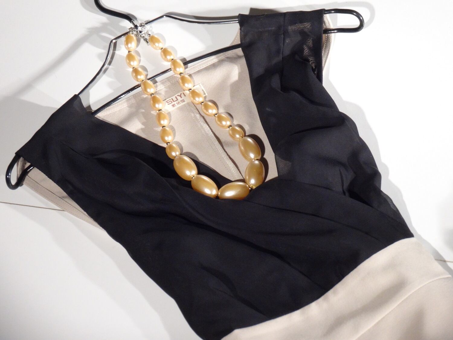 黒とベージュの落ち着いたバイカラーのワンピース。胸元カシュクールとストレートなラインが大人の女性の魅力を倍増させてくれます。左脇ファスナー。裏地なし。