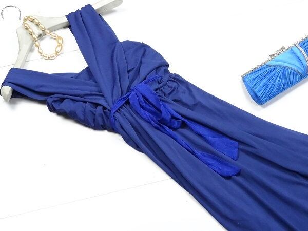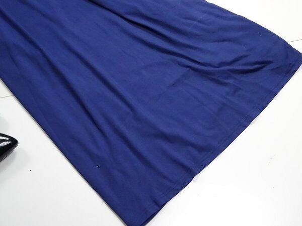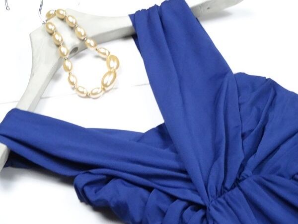 深い青がシックなロング丈ドレス。胸元はベアトップの上にウエストから肩にかけて伸びた生地がV字ラインを形作るデザイン。ゴム仕様のウエストは伸縮性があり着心地が良く、やわらかなシフォンのウエストリボンでアクセントつけています。シックで大人テイストの一着。ファスナーなし。裏地あり。