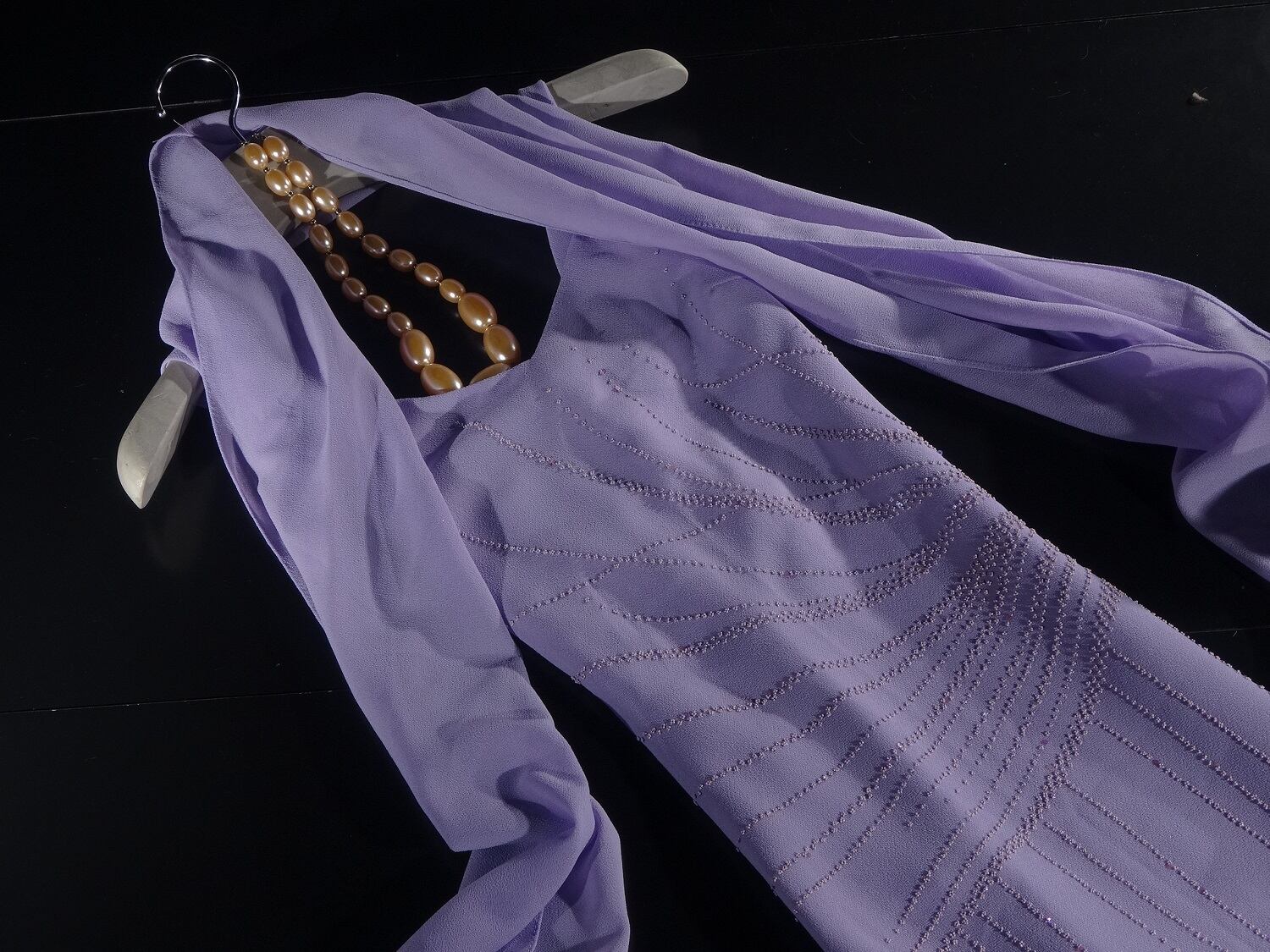 USAインポ-トドレスです。細かいつぶつぶと小さなスパンコ-ルが大人っぽく丈も膝下丈なので大人向けのドレスです。デザインも大変エレガントで女性度アップ!裏地有り。ファスナ-なし。スカ-フ付き。