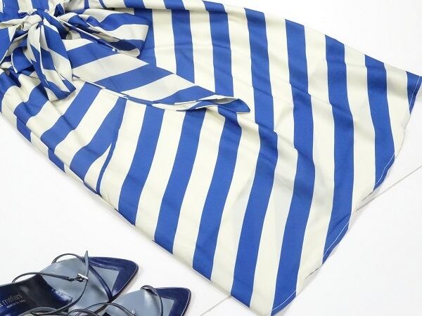 太目のボ-ダ-が優雅でマリン気分エレガントなデザインが上品かつ優雅な女性を演出してくれます。色々な場面で貴方を輝かせてくれます。裏地あり。ファスナ-無し(かぶるタイプ)