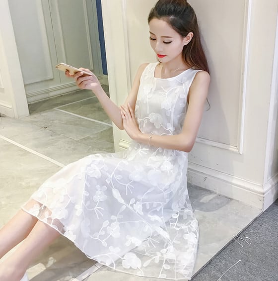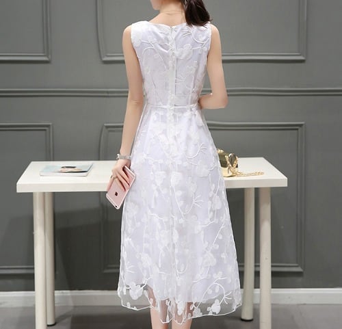 花模様のレース仕立てマキシ丈のワンピース。白の下地の上に、大きな花と葉を白糸で刺繍したレースをかぶせていて、薄い透け感がやわらかな印象を与えてくれています。大きなラウンドネックにノースリーブも全体の中でバランスが良く、ピュアでフェアリーなデザインになっています。煌めく太陽の光の中でも、また新緑の爽やかな風の中でも、着る人を美しく魅せてくれる一着です。透け感があるのでインナー着用をお勧めします。背中ファスナー。