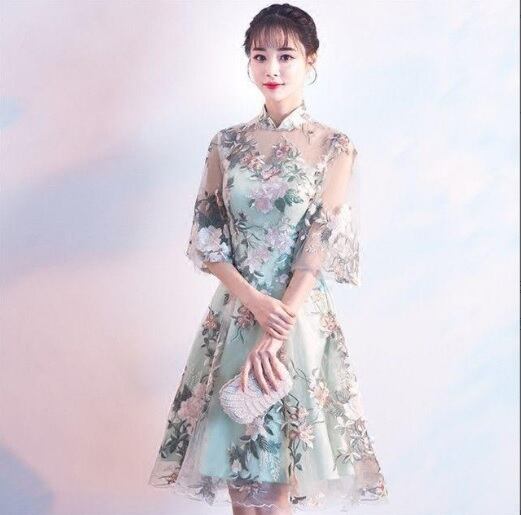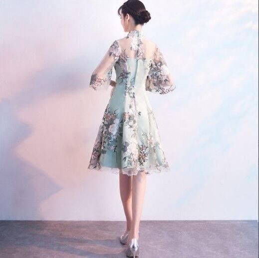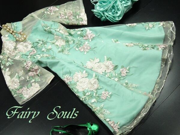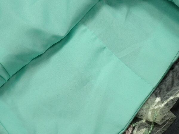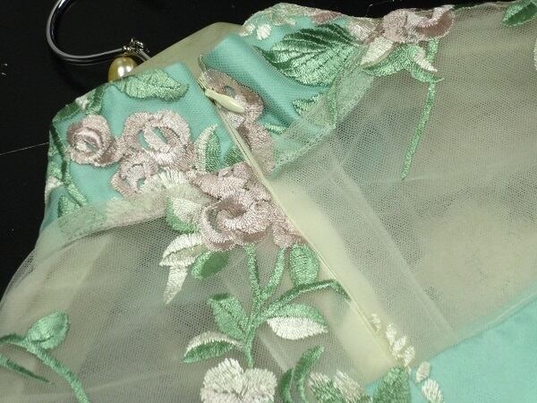 チャイナ風刺繍が美しいワンピ-ス。緑色のサテン地の上に刺繍を施したチュールを重ねています。胸元と袖の透け感が魅力的なデザイン。大人の魅力を醸し出してくれる一着です。裏地なし。背中ファスナ-有。