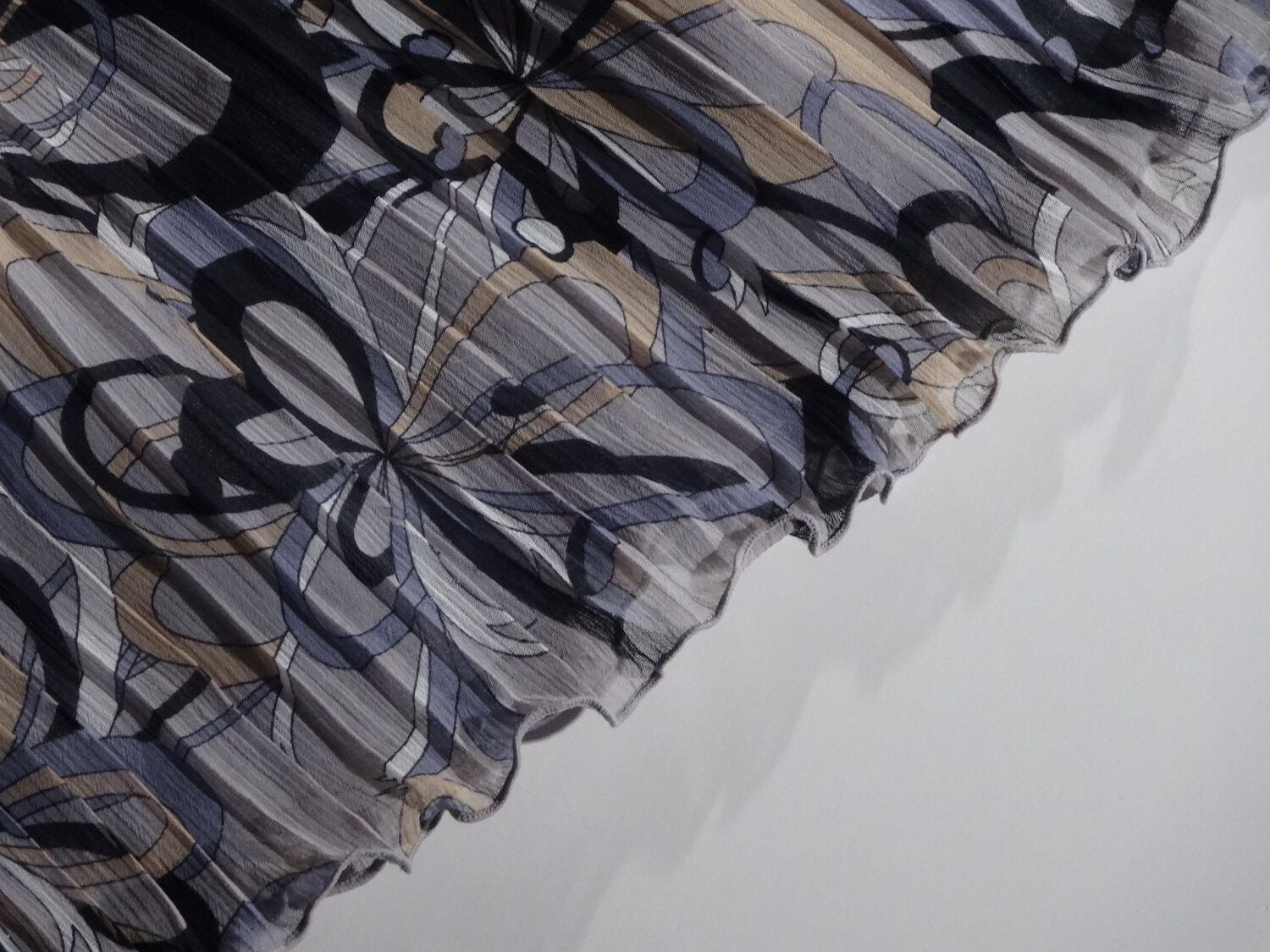 グレー地に大きな花模様がプリントされたプリーツスカート。ウエストは総ゴム仕様で伸縮性があり、小さなプリーツが裾にかけて緩やかに広がるやさしいデザインになっています。ファスナーなし。ペチコ-ト付き。