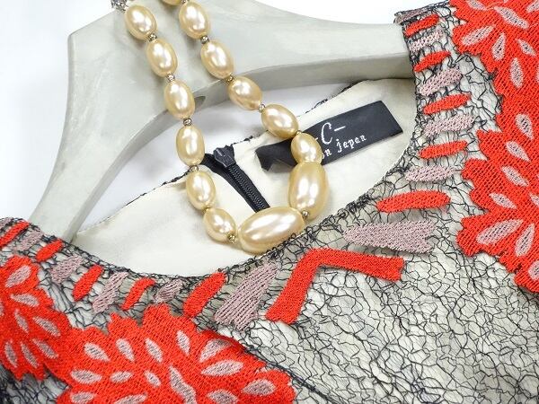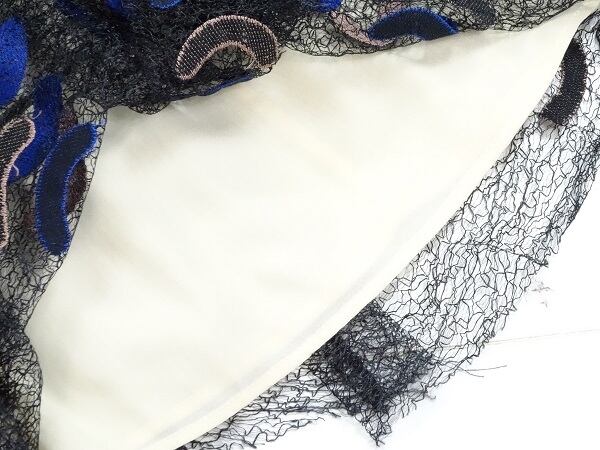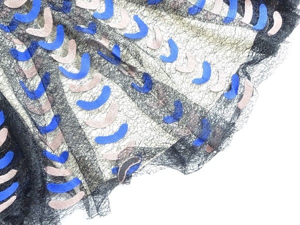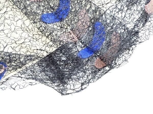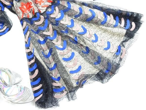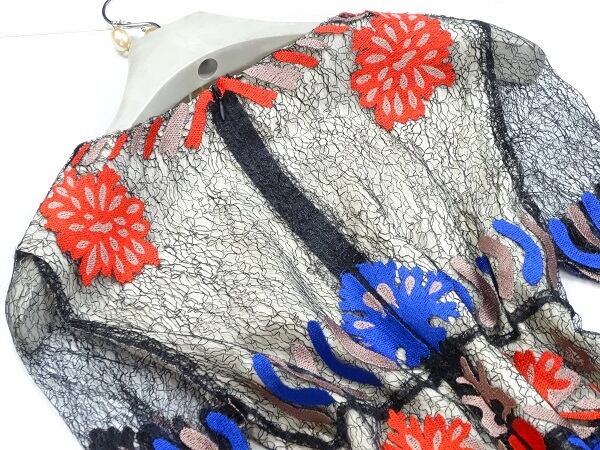 鮮やかな色合いの刺繍が魅力的なワンピース。繊細な黒のネット生地に、パッチワーク風にカラフルな刺繍をあしらっています。ネット地の下に見える落ち着いたベージュの色と重なって、エスニックな不思議な印象に仕上がっています。背中ファスナー。袖以外裏地あり。