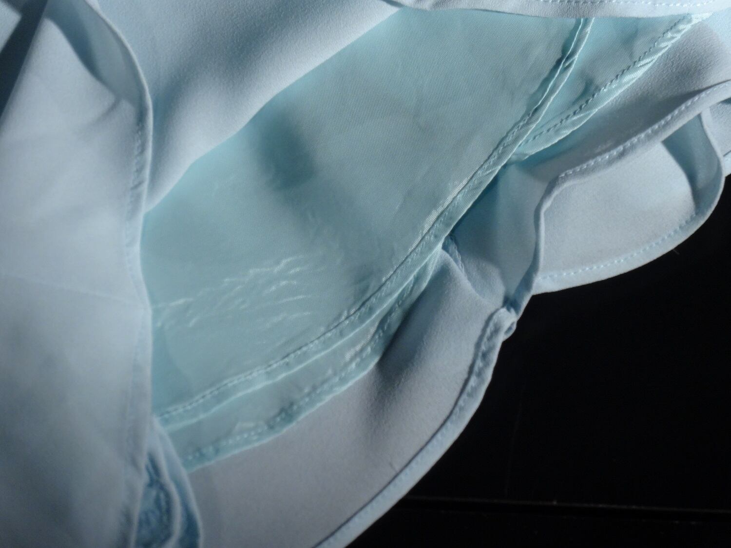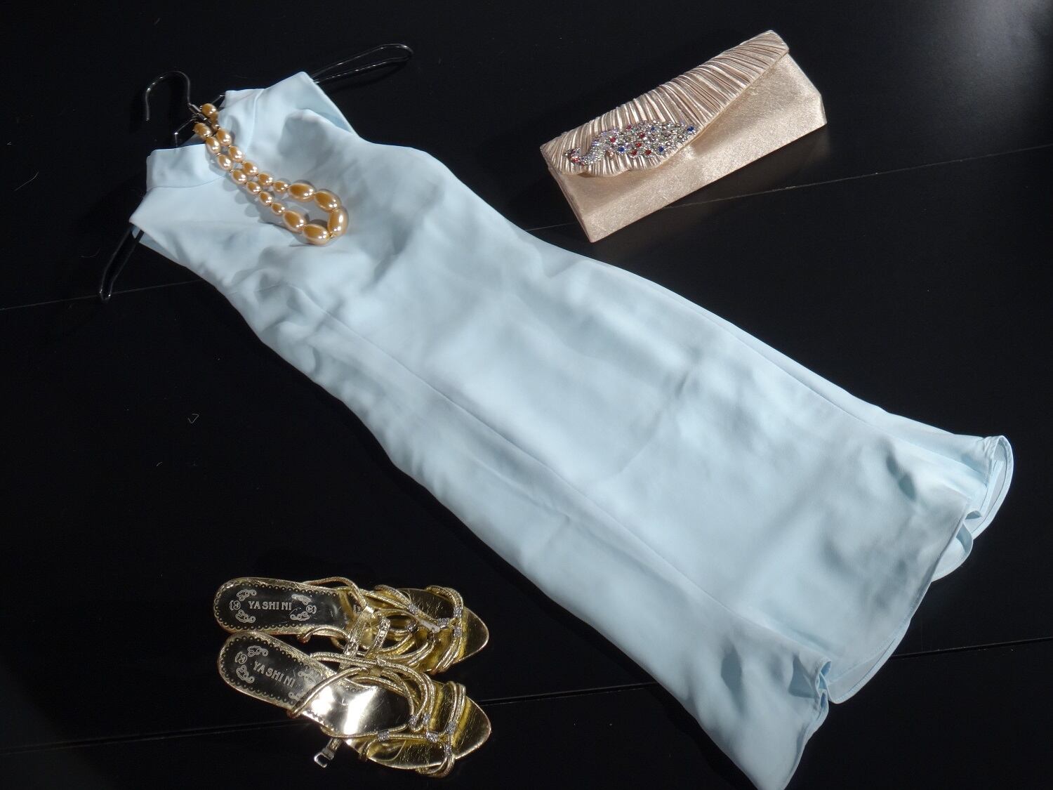 すそフレア、さわやかな水色のスレンダーフォルムのワンピース。襟は4cm高さ。後襟元はくるみボタン留めで、襟から21cmの深さでV字カットにデザインにされています(画像6枚目)。前側のさわやかさと、後側のセクシーさが絶妙なコンビネーションの一着です。裏地有。