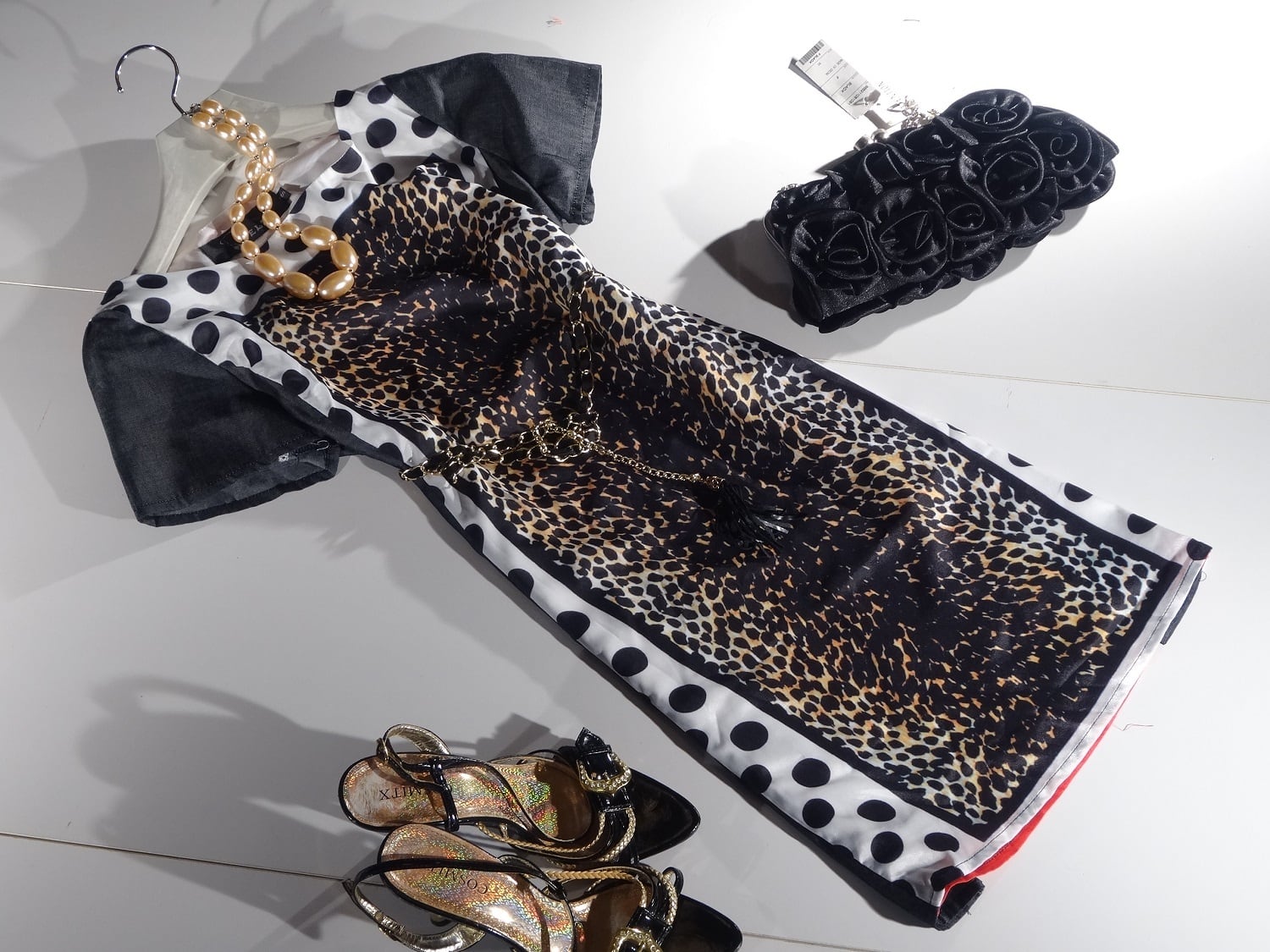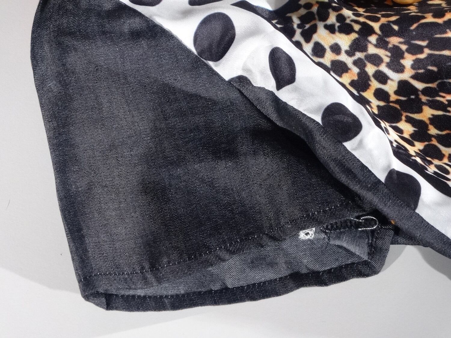 前身頃部分と後身頃部分のセンタ-にシルク地のプリントが上品かつ高級感を漂わせてくれています。裏地あり。左脇ファスナ-有。チェ-ンベルト付。