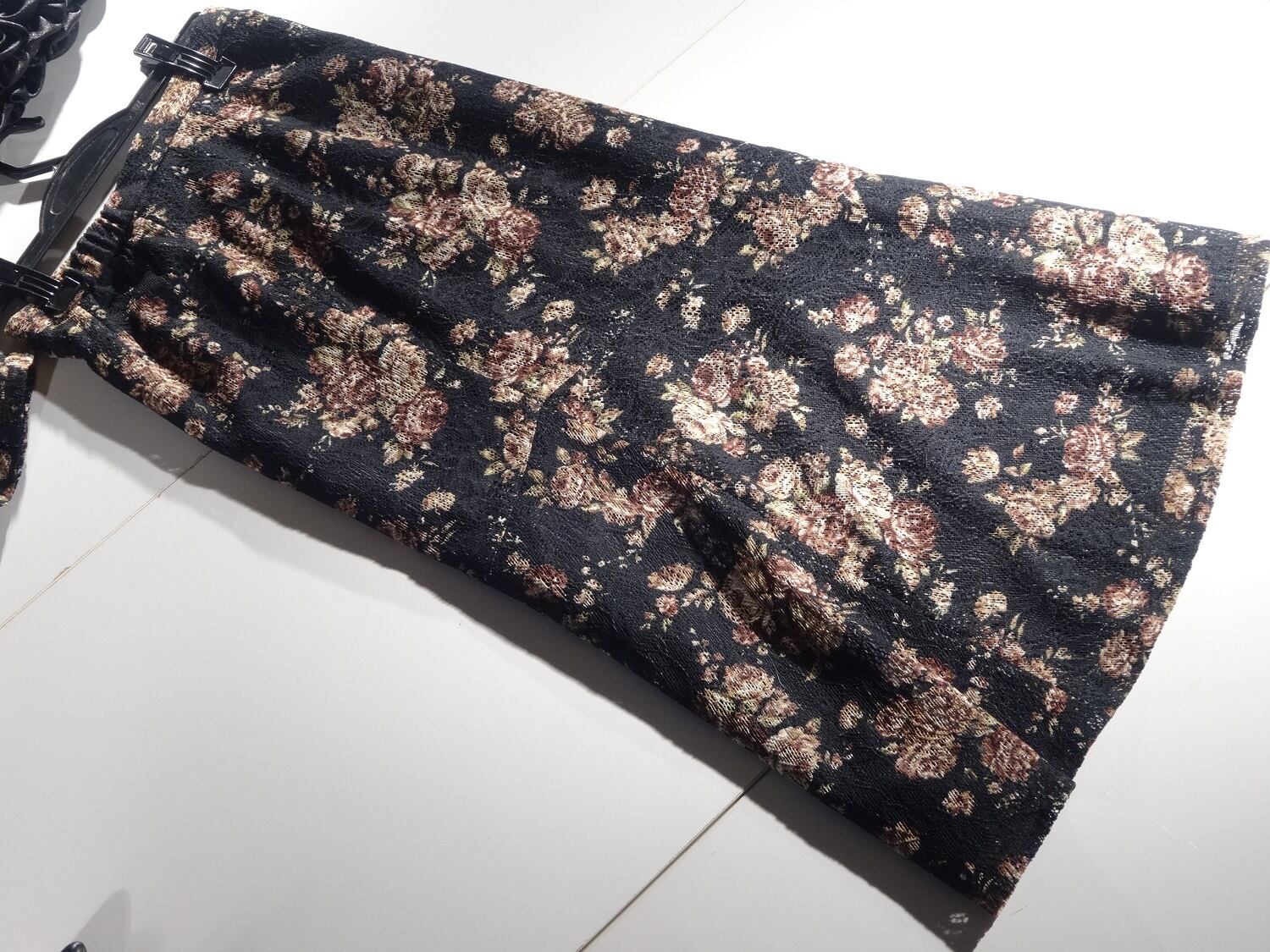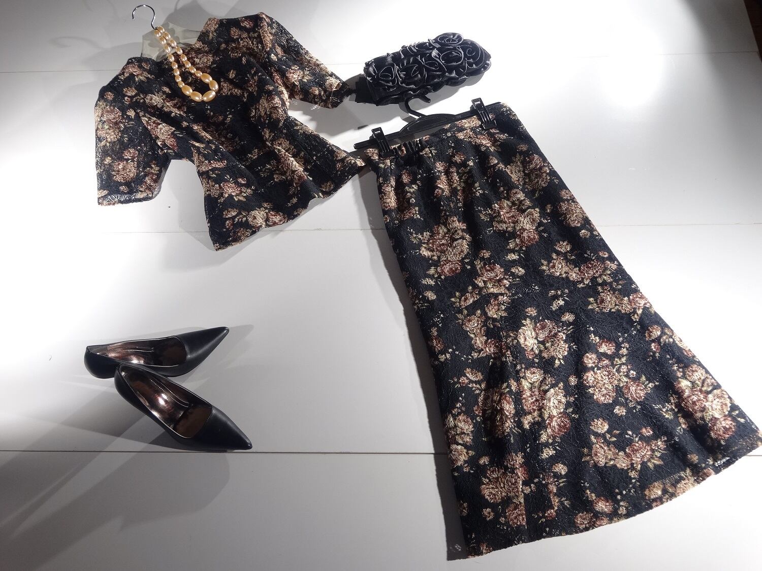 薔薇柄がとてもオシャレでしぐさを優雅に見せてくれる贅沢なお洋服です。黒地と赤茶のコントラストがシックな雰囲気を演出します。(チュニック)背中ファスナ-有。(スカ-ト)サイドファスナ-有。