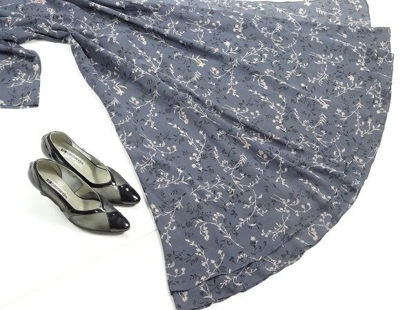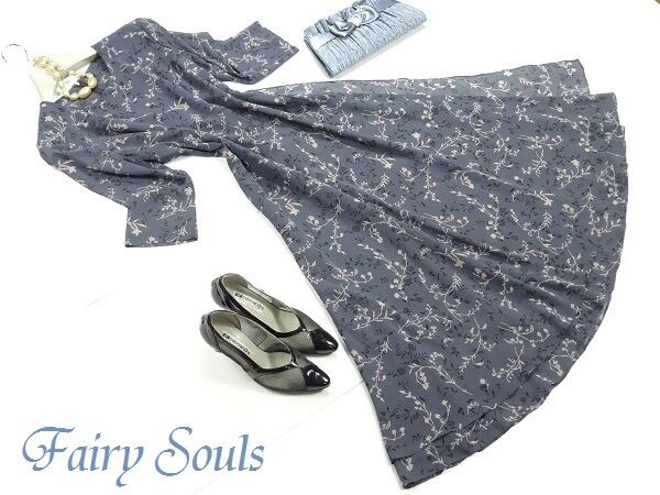 シックな花柄のワンピ-スです。スカ-ト部分はフレア-になっていて柔らかい生地がつかわれているので動くたびに裾がなびきとても上品です。背中ファスナー。裏地付。