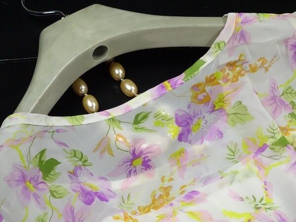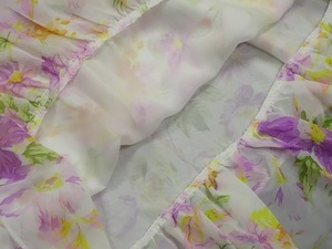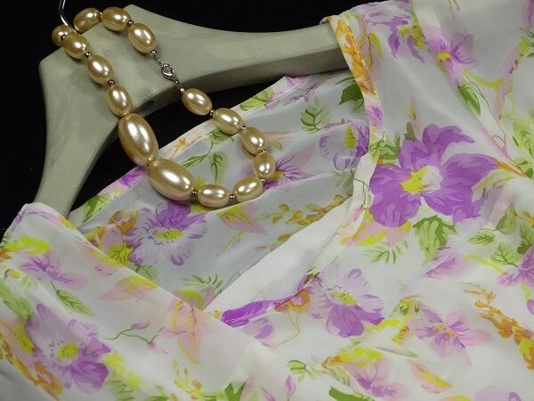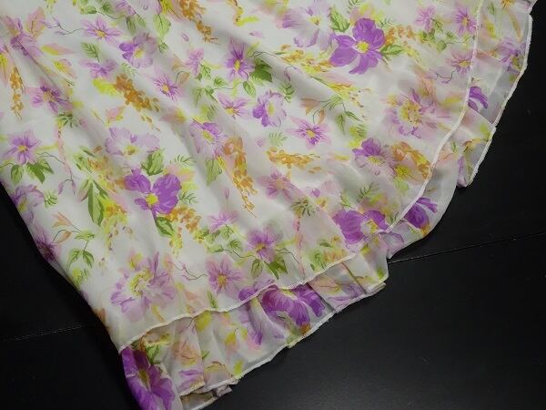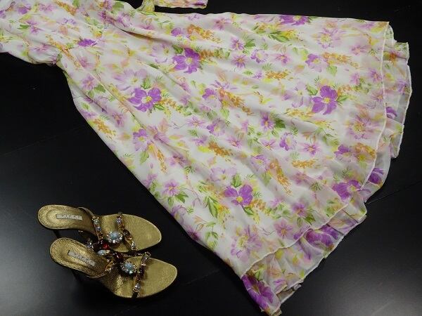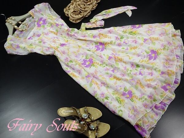 やさしいパステルトーンの花柄マキシ丈のワンピース。やらわかでさらっとしたシフォンの生地をたっぷりと使用し、ぷっくらとした袖と、裾のフリルがキュートさをアップ。周りの人をほのぼのとさせてくれるフェミニンな一着です。ウエストはゴム仕様なので長時間着用していてもウエストを締め付けません。ファスナーなしの被るタイプ。共布ウエストリボンベルト付。裏地あり。