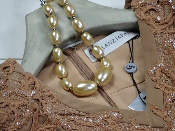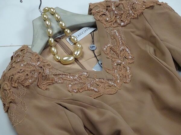 深すぎないVネックは上品でデコルテラインもすっきりとても綺麗です。肩・首周り。裾に施された刺繍レ-スが女性度UP!!とてもエレガントな一着です。背中ファスナー。裏地付。首後フック。
